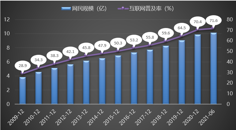 图3展示了2009-2021年全国网民规模及互联网普及率变化情况,从图中可以看出,截至 2021年6月,我国网民总体规模超过10亿,庞大的网民规模为有助于我国经济高质量开展给予强大内生动力,加速我国数字新基建建设、打通国内大循环、促进数字政府服务水平提升。