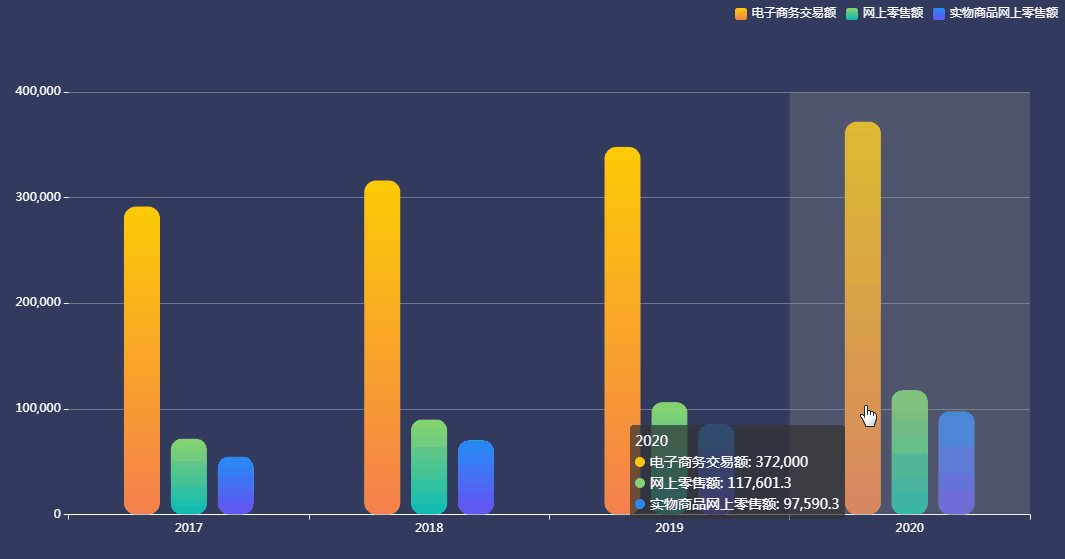 该图展示了2017-2020年全国电子商务交易额情况,全国电子商务交易额逐年递增。2020年,全国电子商务交易额37.2万亿元,网上零售额1.18万亿元,其中实物商品网上零售额9.76万亿元,增长14.8%,占社会消费品零售总额的24.9%,我国数字化消费潜力巨大,开展迅速。