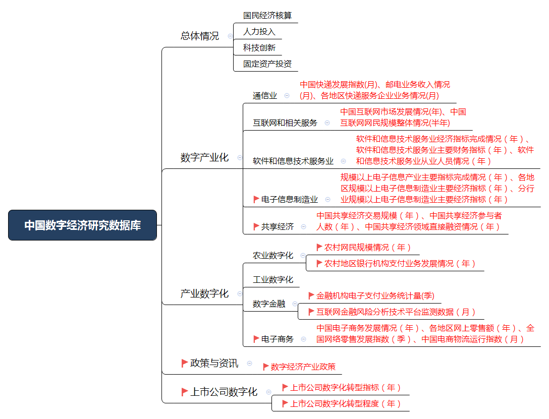 CSMAR数字经济研究数据库给予经济开展总体情况(国民经济核算、人力投入、科技创新、固定资产投资)、数字产业化(通信业、互联网和相关服务、软件和信息技术服务业、电子信息制造业、共享经济)、产业数字化(农业数字化、工业数字化、数字金融、电子商务)、政策与资讯及上市公司数字化数据。