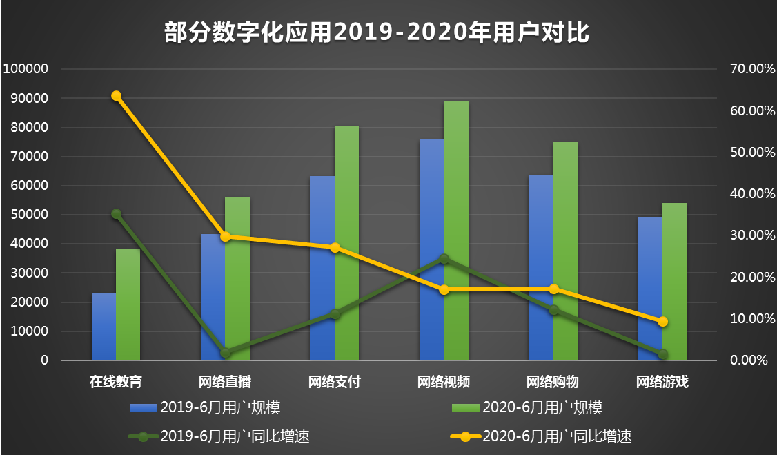 图4展示了2019-2020年,在生活领域,部分数字化应用的用户规模及同比增速情况。2020年上半年,出于疫情防控需要,经济活动加速向线上迁移,人民必须居家完成工作、教育、饮食、娱乐等活动,在线教育、网络直播、网络支付、网络购物、网络游戏用户同比增速均快于2019年上半年。新冠疫情在极短时间内激发了数字化新需求,有助于数字化转型跨越式开展。